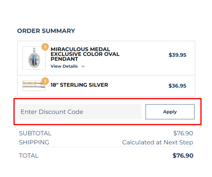 Place the saved promo code in the “Enter Discount Code” box and hit “Apply”.