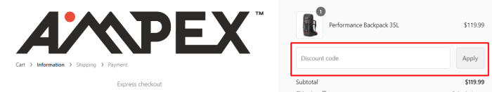 Place the saved promo code in the “Discount code” box and hit “Apply”.