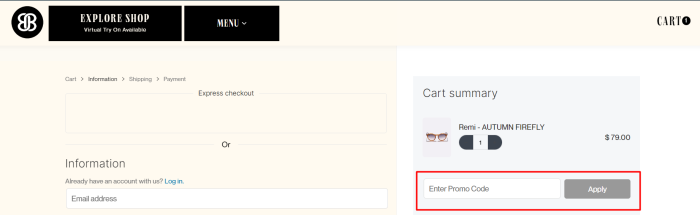 Click on the “Have a promo code? Click here” entry in the order summary section. Fuse the stored promo code with the “Enter Promo code” box and hit “Apply”.