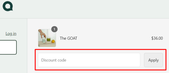 Enter the saved promo code in the “Discount code” box and hit “Apply”.