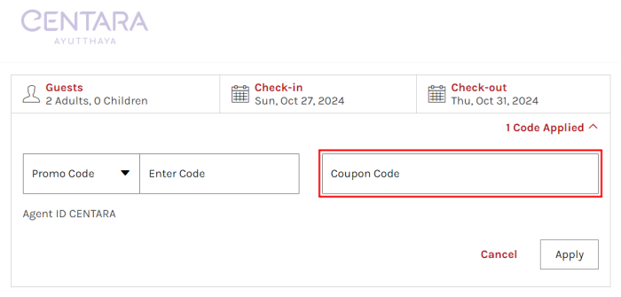 Scroll down the page to the payment section, click on the “Add coupon”, put the saved promotional code in the drop-down “Coupon Code” box, and push “Apply” to finalize your reservation at the sweetest discount.