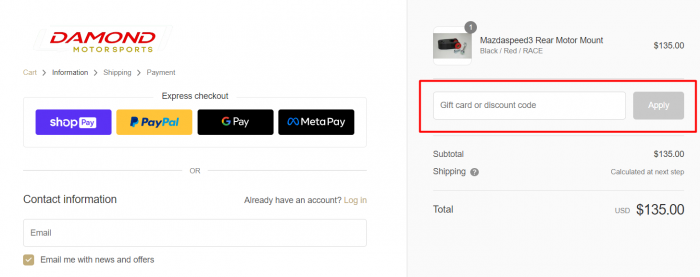 Enter the saved promo code in the “Discount code” and press “Apply”. Build the ultimate driving experience with Damond Motorsports’ parts.