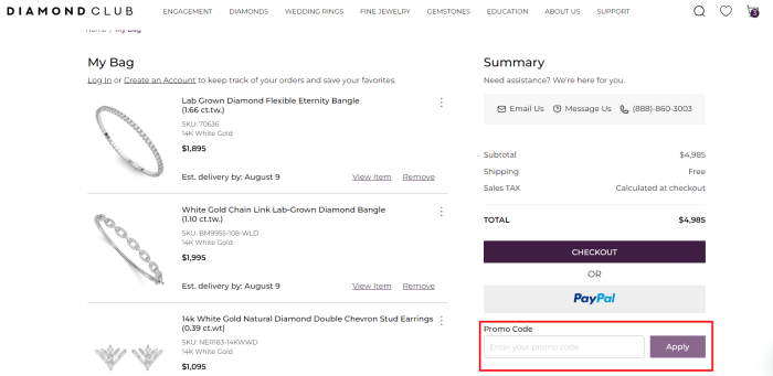 Put the saved promo code in the “Promo code or gift card” box and hit “Apply” to buy your fine jewels for a song.
