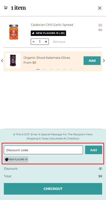 Place the saved promo code in the “Discount code” box, hit “Add”, and proceed to the checkout. You can redeem the code at the checkout as well – place it in the “Discount code or gift card” box and hit “Apply”.