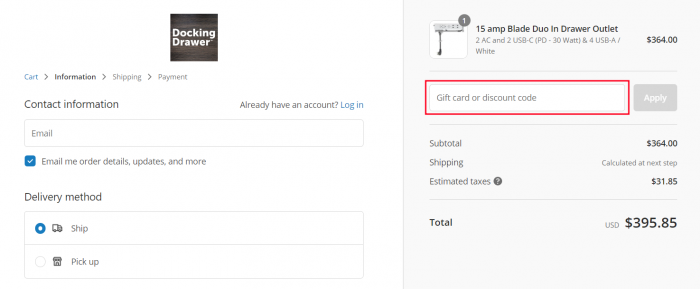 Find the "Gift card or discount code" field on the checkout page, where you should enter the code you copied. Apply the discount and get a favorable total amount of your order!