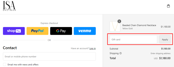 Shine a spotlight on the “Gift card” box in the order summary section. Empty the clipboard, pouring the saved promo code into the box. Hit “Apply” to put the code into effect. Add extra touches of breathtaking charm to your look with luxury jewels.
