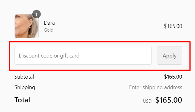 Put the squirreled-away promo code in the “Discount code or gift card” box, and push “Apply” to beautify yourself with sustainable and ethically made jewelry.