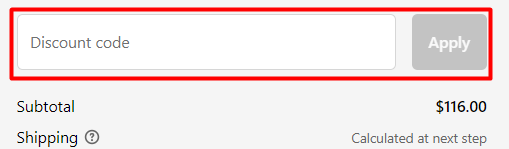 Enter the saved promo code in the “Discount code” box and hit “Apply”.