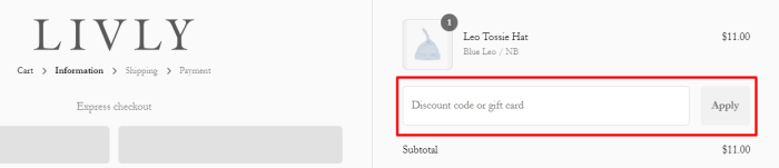 Enter the saved promotional code in the “Discount code or gift card” box and hit “Apply” to check out your Pima cotton baby clothing at a chic deal.