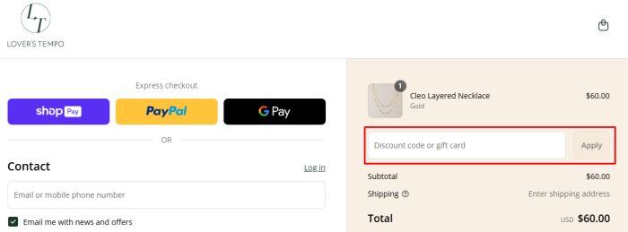 Place the saved promo code in the “Discount code or gift card” box and hit “Apply”.