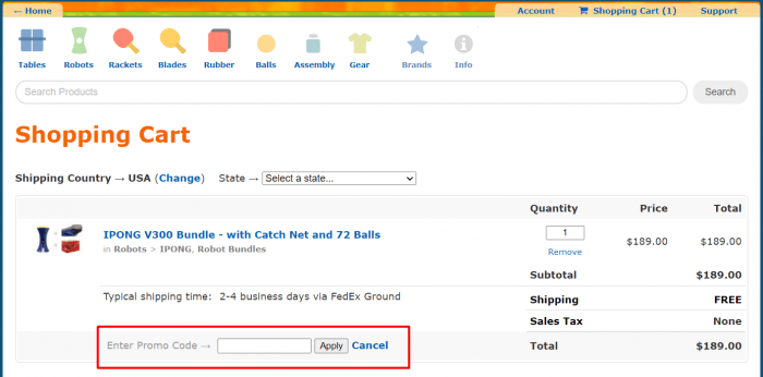 Click on the “Have a Promo Code?” entry below the list of the added items. Paste the chosen promo code in a drop-down box and press “Apply”. Enjoy your table tennis and ping-pong supplies and equipment.