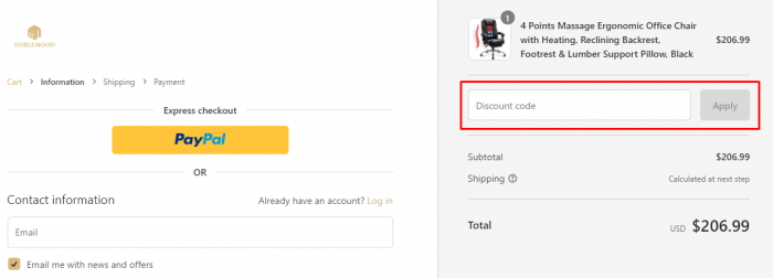 Add the promo code you copied to the "Discount code" field and apply it to your order. The total amount will be reduced!