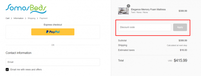Paste the saved promo code in the “Discount code” box and press “Apply”. Sleep well. Sleep soundly. Sleep comfortably on your premium foam mattress.