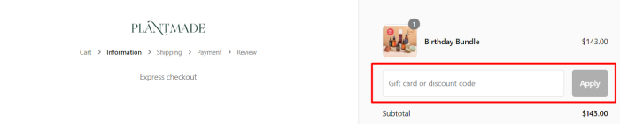 Enter the saved promo code in the “Discount code” box in the cart summary menu and hit “Apply” – or proceed to checkout, type the code in the “Gift card or discount code” box and press “Apply”.